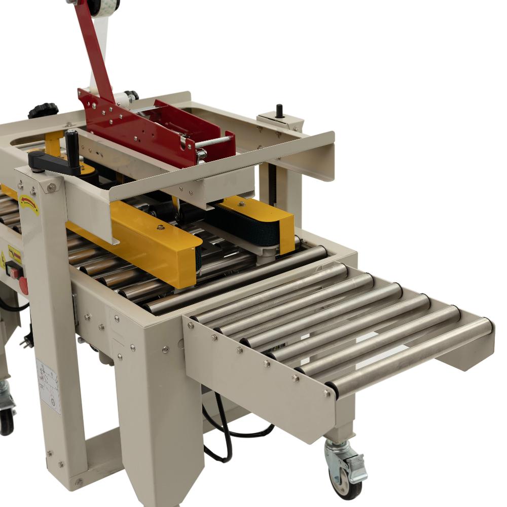 это профессиональное оборудование для быстрой и аккуратной заклейки верхних и нижних стыков картонных коробов клейкой лентой (скотчем). Модель предназначена для малых и средних предприятий в сфере пищевого производства, упаковки и фасовки, складской логистики и интернет-торговли. Заклейщик оснащён боковыми конвейерными ремнями для автоматической протяжки короба, что обеспечивает непрерывный процесс упаковки без необходимости постоянного присутствия оператора.