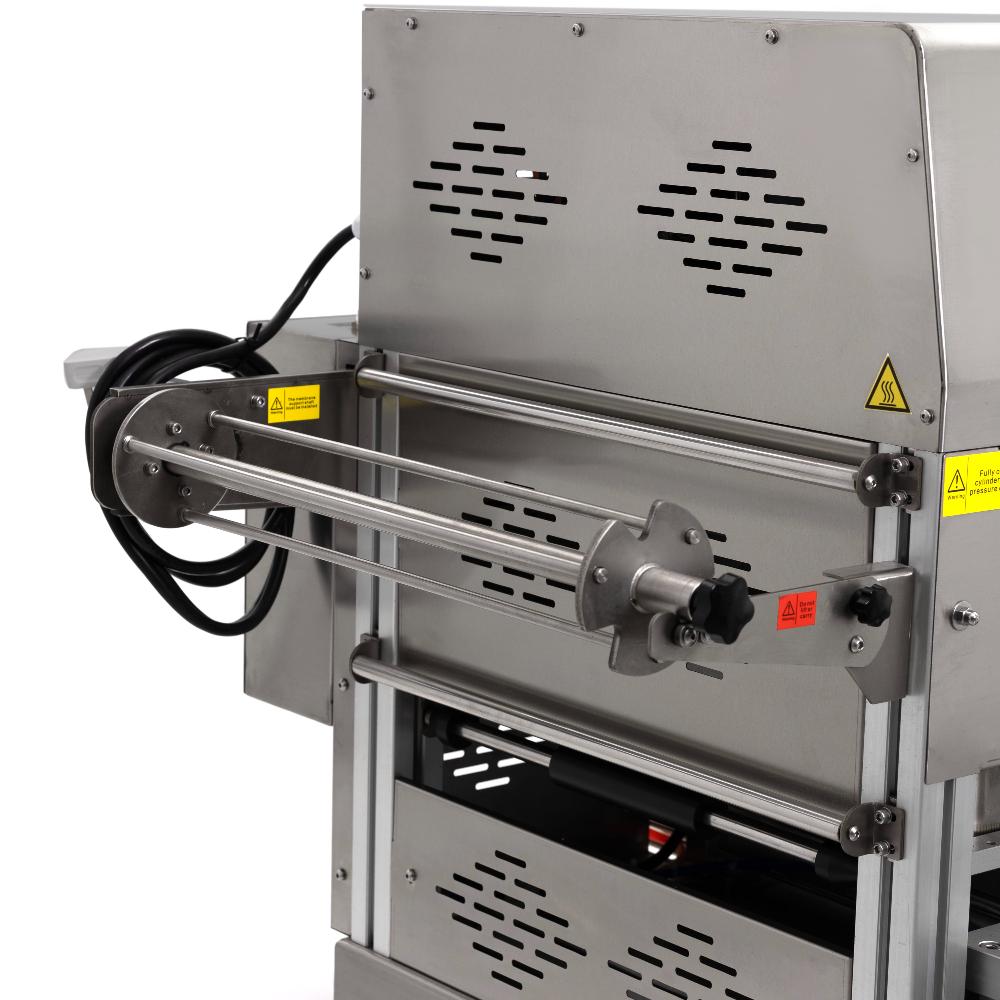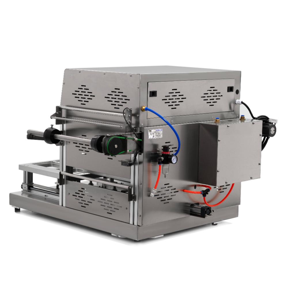 - Автоматизация и точная настройка. Управление осуществляется через сенсорный экран с возможностью программирования температуры нагрева (два терморегулятора), времени запечатывания, подъёма и накачивания газа. Аппарат автоматически обрезает плёнку по контуру лотка, обеспечивая аккуратную упаковку.
